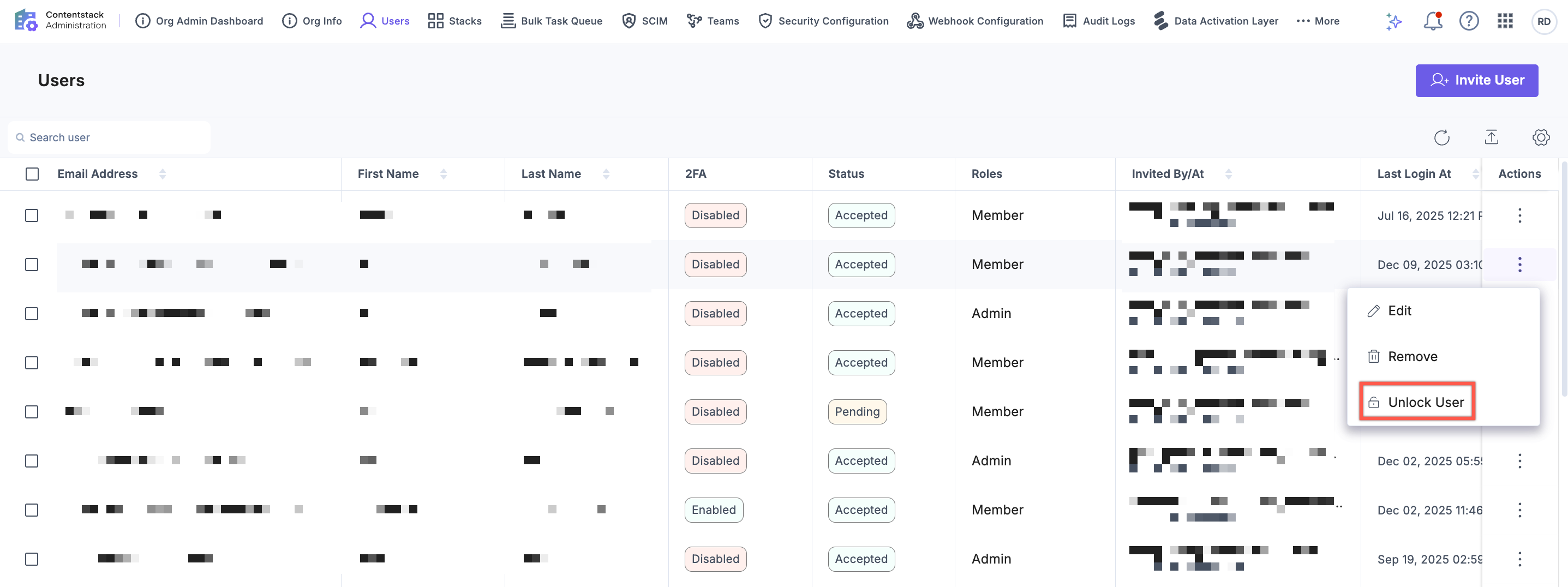To unlock users individually or in bulk, log in to your Contentstack account and perform the following steps: