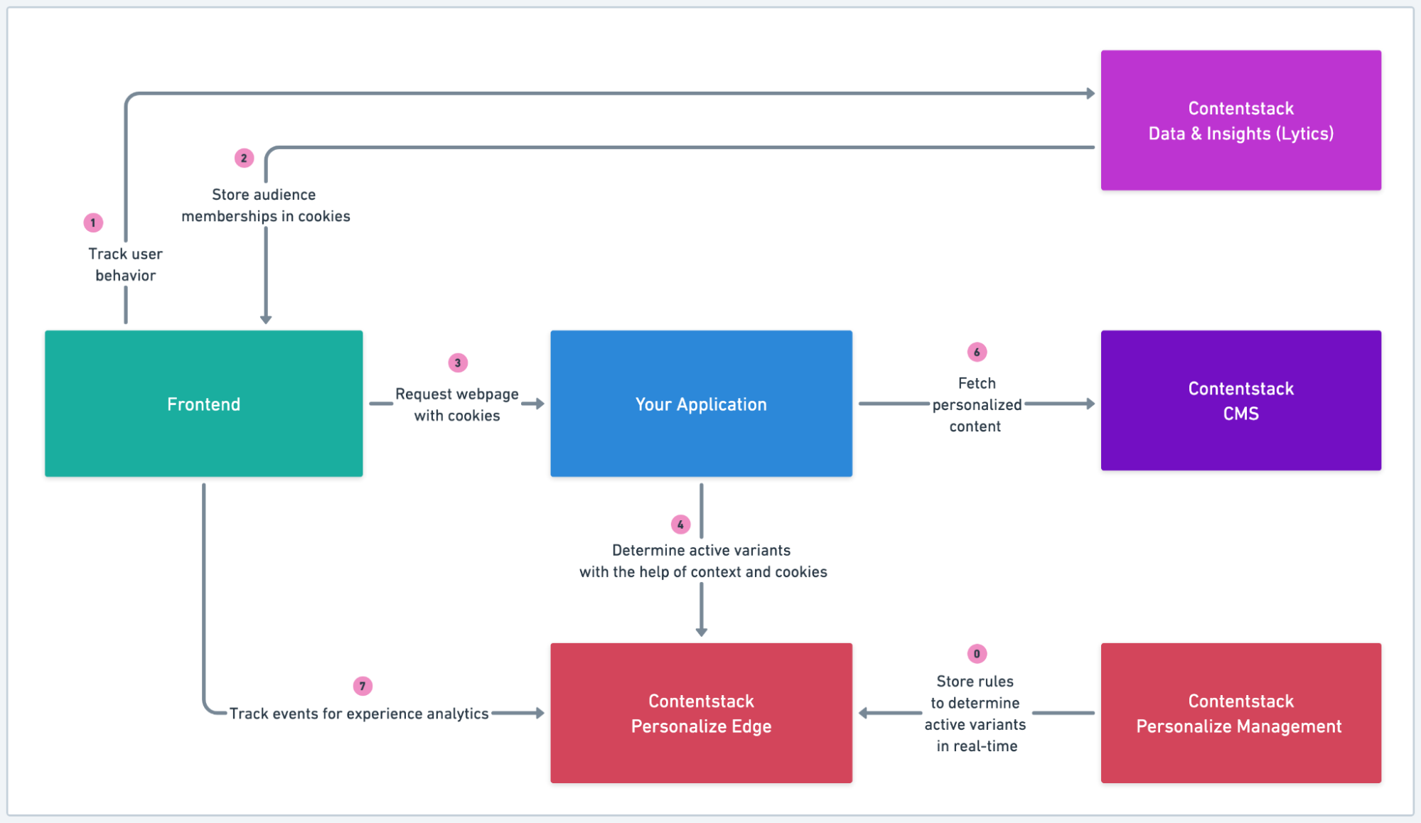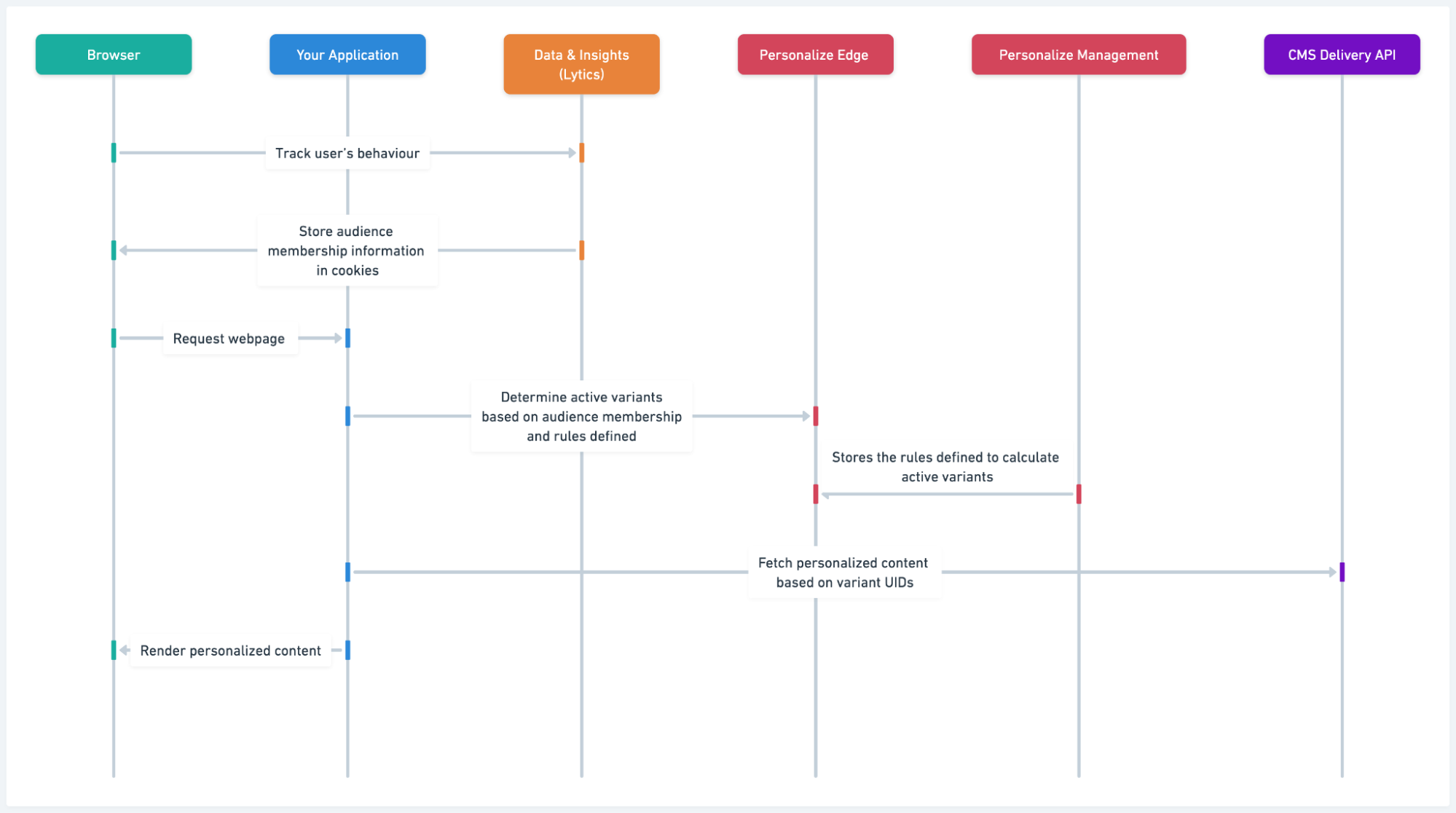 This guide explains the complete flow of personalization delivery in Contentstack. It covers how user data is consented for and collected, how Data & Insights (Lytics) tracks user profiles and audience memberships, how Personalize assesses audience memberships and user context to determine active variants, and how the Personalize Edge API and Contentstack Delivery API (CDA) work together to render the correct content variants in real-time.